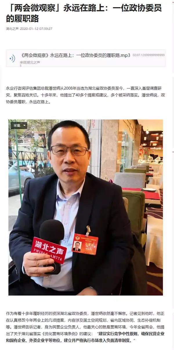 2020年1月11日至15日,政協(xié)湖北省十二屆三次會(huì)議在武漢召開。省政協(xié)委員、省房協(xié)會(huì)長、永業(yè)行董事長兼總裁潘世炳參加會(huì)議,并向大會(huì)提交了《關(guān)于推進(jìn)湖北省實(shí)施生態(tài)補(bǔ)償?shù)慕ㄗh》《關(guān)于推進(jìn)國土空間規(guī)劃的幾個(gè)建議》《關(guān)于湖北省落實(shí)<優(yōu)化營商環(huán)境條例>的幾點(diǎn)建議》《深化區(qū)域協(xié)同 推動(dòng)鄂黃黃臨空協(xié)同發(fā)展軸建設(shè)的幾點(diǎn)建議》等多份提案,人民網(wǎng)、《中國經(jīng)營報(bào)》、《湖北日?qǐng)?bào)》、湖北廣電、湖北之聲、長江云等多家媒體從多個(gè)角度對(duì)潘世炳委員的提案進(jìn)行了深度挖掘和報(bào)道。