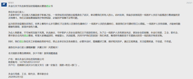 “為眾人抱薪者,不可使其凍斃于風(fēng)雪。抗擊肺炎、守護(hù)醫(yī)護(hù)人員安全是我們義不容辭的責(zé)任。為了讓一線醫(yī)護(hù)人員有更加充足、更加安全的保障,永業(yè)行黨委、工會(huì)、職代會(huì)、青年聯(lián)合會(huì)共同倡議募捐,希望大家精誠團(tuán)結(jié)、奉獻(xiàn)愛心、共戰(zhàn)疫情,共同守護(hù)我們的家園!”2月1日,一封募捐倡議在永業(yè)行工作群內(nèi)發(fā)布。潘世炳帶頭捐款,全體黨員和各地員工也迅速響應(yīng),不到48小時(shí),收到約700名員工共計(jì)20余萬元捐款。截至2月17日,永業(yè)行及千余名員工累計(jì)籌得善款近40萬元,陸續(xù)匯入武昌區(qū)慈善總會(huì)等慈善機(jī)構(gòu),期望通過點(diǎn)滴愛心,為戰(zhàn)勝疫情盡永業(yè)行綿薄之力。