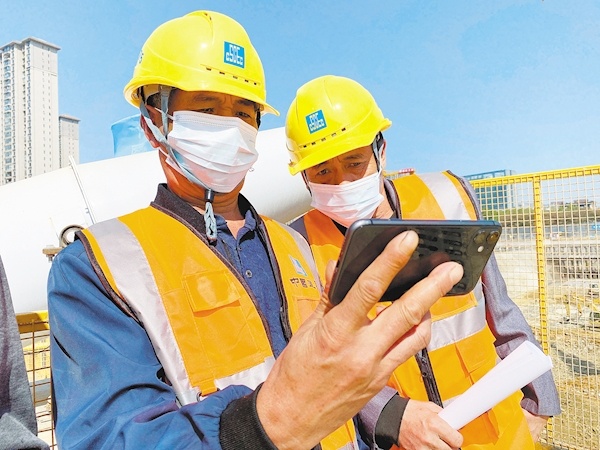 10月16日,中建三局的建設(shè)者在項目工地上用手機收看黨的二十大開幕會盛況。(湖北日報全媒記者 柯皓 通訊員 謝杰夫 朱楨源 攝)
