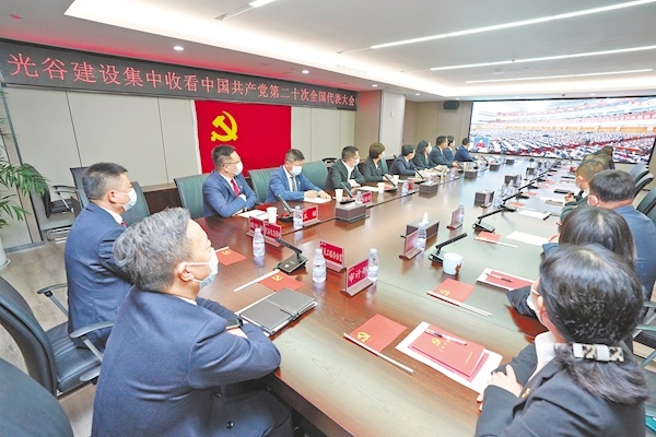 10月16日,武漢光谷建設(shè)投資有限公司黨員代表集中收看黨的二十大開幕會直播。(湖北日報全媒記者 魏錸 攝)