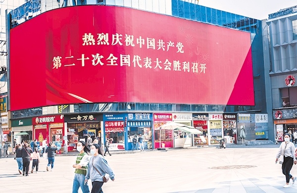 10月16日,武漢市江漢路步行街超大型電子顯示屏循環(huán)播放標(biāo)語,讓市民們感受到了濃厚的盛會氛圍。(湖北日報全媒記者 朱熙勇 攝)